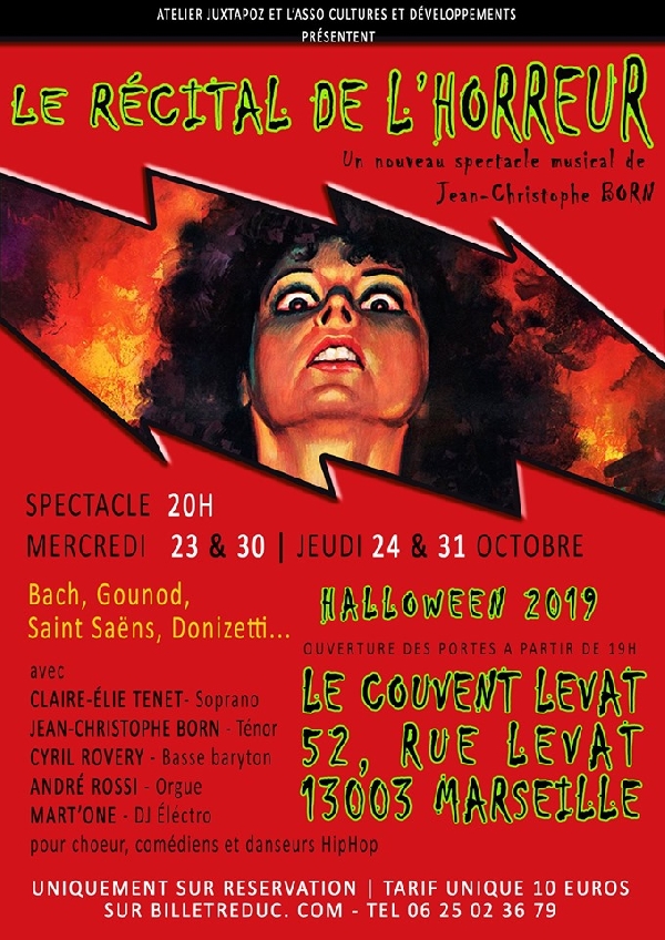 Entouré d'artistes variés et talentueux, il se frotte à l'univers des films d'horreur, évoqués par de l'opéra, des comédies musicales, de l'électro, du hip hop, des scènes de Grand Guignol, des choeurs inquiétants... Bach, Gounod, la Danse macabre de St Saëns, des bruitages et les musiques du magistral Dj électro Mart'one.